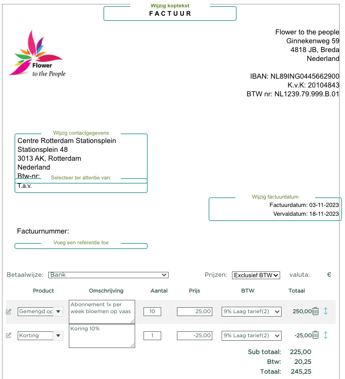 De tweede factuurregel past op deze 10-tal boeketten met een totaal van €250,-, 10% korting toe, hetgeen neerkomt op een korting van €25,-