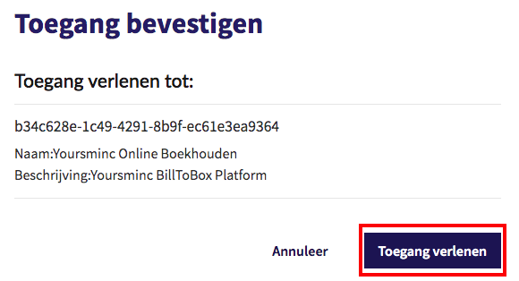 Je ziet nu dat je gevraagd wordt om de toegang tot Yoursminc Online Boekhouden te bevestigen. Druk op Toegang verlenen.