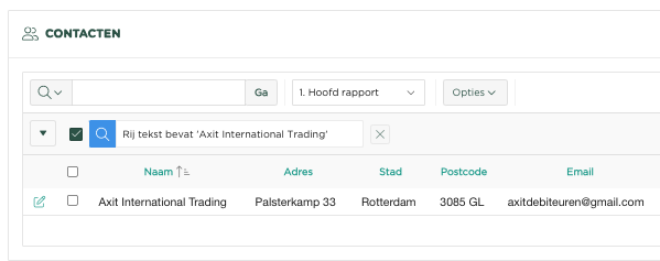 Navigeer naar de pagina Contacten en zoek naar de betreffende klant